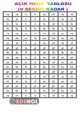 AÇIK HECE TABLOSU(V SESİNE KADAR)