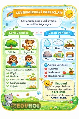 İlkokul öğrencileri için hazırlanan bu renkli bilgi kartı ile çevremizdeki varlıkları canlı ve cansız olarak tanıyoruz.