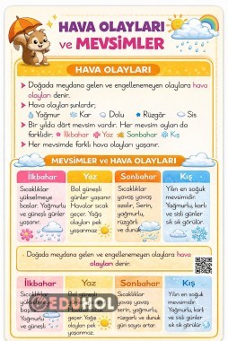 İlkokul öğrencileri için hazırlanmış bu bilgi kartı; hava olayları ve mevsimleri sade, anlaşılır ve görsel destekli şekilde anlatır. Ders içi kullanım, tekrar çalışmaları ve pano etkinlikleri için uygundur.