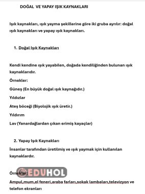3 sınıf Doğal ve yapay ışıklar kaynakları