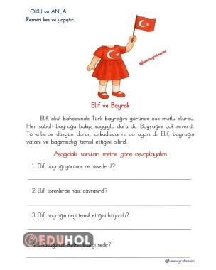 Elif ve Bayrak Oku ,Anla ve Soruları Cevapla Elif ve Bayrağı boya Kız ve erkek için ayrı ayrı kes ve yapıştır 4 aynı metin, 4 farklı etkinlik