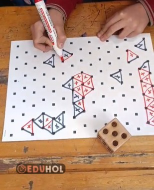 Şablon kağıt zar ve kalemle oynann çok basit fakat oldukça eğlenceli bir oyunumuz var.İlk oyuncu zar atar attığı sayı kadar noktayı birleştirerek kenar çizgisi çizer ve oluşturabiliyorsa üçgen oluşturmaya çalışır.oluşturulan üçgenin içine kendi rengi ...
