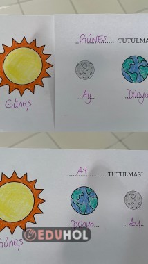 Çıktı alırken arkalı önlü ve kısa kenardan yazdır şekilde alınması gerekiyor. Kâğıdın sağ tarafını Güneş’i kapatmayacak şekilde katladığımızda üst tarafta Güneş kâğıdın içinde Ay tutulması kalıyor. En sonda da deftere yapıştırıyoruz. İğneli etkinlik ...