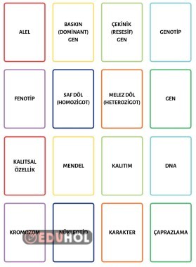 Kalıtım ile ilgili 16 farklı kelime ve açıklaması flashcard olarak mevcut. Çift yüzlü kullanmak isteyenler için, yazdırırken kısa kenardan olarak yazdır seçeneği seçilirse kelimenin tam arkasına açıklaması denk gelmektedir.