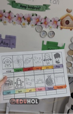 Kelime ve heceleri renkli kağıtlara basıp çizgili yerlerinden kestim ve sınıfın farklı yerlerine bantladım. Bahçede olsa daha güzel olurdu.