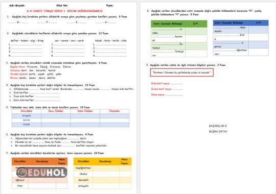 TÜRKÇE DERSİ 1. BÖLÜM DEĞERLENDİRMESİ (PDF)