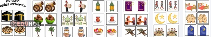 Ramazan ayı etkinlikleri kapsamında eğitim ve eğlence amaçlı hazırladığım RAMAZAN HAFIZA KARTLARI OYUNU 40 ADET eşleştirme kartından oluşmakta 20 farklı Ramazan teması bulunmaktadır.Kart çerçevesi ölçülerine göre fon kartonu kesilip temalar üzerine y ...