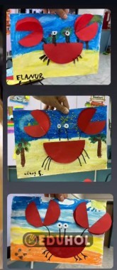 Suluboya ile boş kağıdı deniz, kumsal ve gökyüzü renkleri boyattım. hazırladığım şablonu kırmızı renkli kağıda çıktı alın ya da boş çıktı alıp kırmızı pastel ile boyatın. Küçük daireleri elleri büyük daireleri gövdesi olacak şekilde yapıştırın. Tahta ...