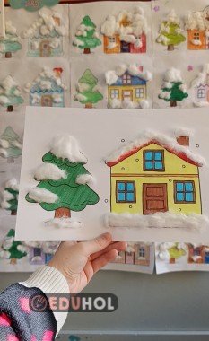 Öğrencilerim 4 farklı evden istediklerini seçip boyadıkları ev ve ağaç görsellerini pamuklarla tamamlayarak karlı bir kış manzarası oluşturdular.