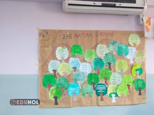 Orman Haftasında, sınıf panosuna Sınıf Hatıra Ormanı yapıyoruz. Ağaçları boyayıp kesiyoruz. Her çocuk ağacının içine kendi adını yazabilir.