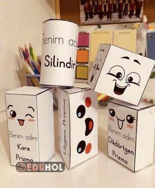Küp, kare prizma, dikdörtgen prizma, üçgen prizma ve silindir açılımından cisimleri oluşturup etkinlikte kullanabilirsiniz. Beğenip takip etmeyi unutmayalım, faydalı olması dileğiyle 🥰