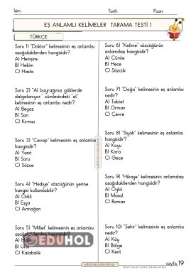 2. Sınıf Türkçe dersi eş anlamlı kelimeler testi 1