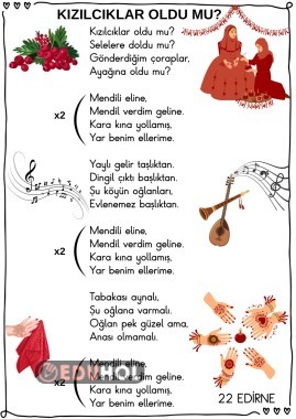 Müzik dersinde çocuklara türkü ezberletmek amacıyla hazırladım. Youtube da bulunan Türkülerle Türkiye Korosu'nun söylediği şekilde sözlerini yazdım. İyi dinleyip, söylemeler :)
