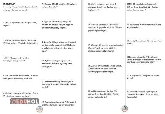 2 BASAMAKLI SAYILARLA ELDELİ TOPLAMA VE ONLUK BOZARAK ÇIKARMA İŞLEMİ GEREKTİRİN PROBLEMLER Etiketler: PROBLEM
