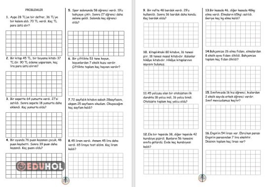 TOPLAMA VE ÇIKARMA OLMAK ÜZERE 2 İŞLEM YAPMAYI GEREKTİREN 16 PROBLEM. ARKALI ÖNLÜ TEK PDF