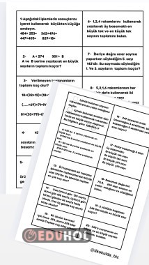 Toplama işlemi ve öncesindeki konulardan karışık problemlerdir. Defter çalışması olarak kullandık. Ortadan ikiye bölerek deftere yapıştırdık. Yan tarafına çözümünü yaptılar .