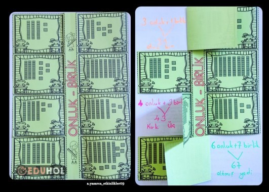 Çıktı aldıktan sonra onluk - birlik yazan yerden deftere yapıştırıyoruz. Çizgili yerlerden görseldeki gibi kestikten sonra aç kapat yaparak görsellerin altına onluk - birlik sayılarını yazıyoruz.