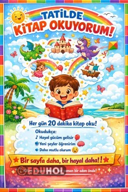 Tatilde öğrencilerdn tek istediğimiz günlük kitap okumalarıdır. Bunu teşvik edici afiş.