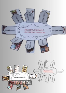 Milli Kültürümüzü oluşturan unsurlar resimleriyle yapıştırılması gereken yerlerden üst üste yapıştırılıp aç-kapa yapılır. Pdf içerisinde yarım sayfa ve tam sayfa seçeneklerinin ikisi de mevcut