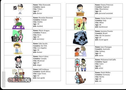 The kids choose a name card. (the cards are upside down, of course). The first volunteer introduces himself/herself. After the others can ask questions. You can play it in pairs also.