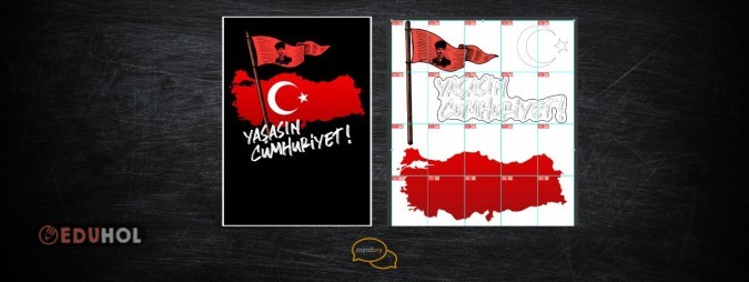 20 adet A4 sayfadan oluşan 29 Ekim pano çalışması siyah zemin üzerinde kullanılmak üzere tasarlanmıştır. PDF dosyasında yer alan görseller kenarlarından kesilerek kapakta yer alan tasarımı oluşturabiliriz. "Yaşasın Cumhuriyet" yazısı beyaz ...