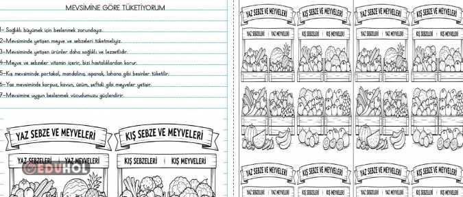 Mevsim meyve ve sebzeleri hakkında kısa özet maddeler halindedir. ayrıca deftere yapıştırmalık meyve ve sebze boyamaları. 1 sayfa 4 kişilik boyama da mevcuttur.