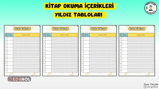 Kitap okuma takibi için oluşturduğum etkinlik kitabının yıldız tabloları bu içeriktedir. Yıldız tabloları ile hedeflenen başarıya ulaşan öğrencileri 40 hafta boyunca ödüllendirip takip edebilirsiniz. Kolaylıklar dile ...