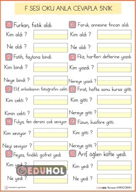 F sesi 10 tane cümleden oluşan oku anla cevapla etkinliği. (5n1k) Destek olup beğenebilirsiniz. Etiketler: fsesi fharfi 5n1k sorular okuanla cevapla birincisınıf okuanlacevapla