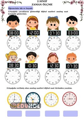 Bu çalışma, 2. sınıf zaman ölçme kazanımlarına uygun olarak hazırlanmıştır. Öğrencilerin analog ve dijital saat okuma, dönüştürme, öğleden önce–öğleden sonra ayırt etme becerilerini pekiştirmeyi amaçlar.