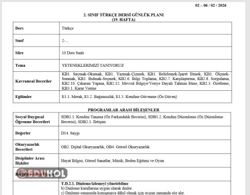 2.SINIF 19.HAFTA(02-06 ŞUBAT 2026)GÜNLÜK DERS PLANLARI