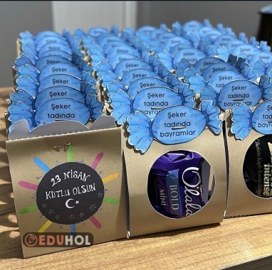 23 Nisan için yiyecek hediye paketi örneği. önceki yıllarda Ramazan bayramı ile denk geldiği için örnek fotoda şeker bayramı yazıyor. Renksiz olanı kraft kağıda çıktı alarak da yapabilirsiniz.