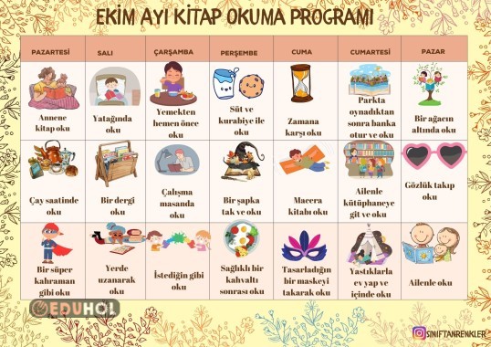 Sevgili öğretmenlerim; öğrencilere kitap okuma alışkanlığı kazandırmak, bunun bir ödev veya zorunluluk gibi görünmemesi ve zevkle kitap okumalarını sağlamak için aylık olarak hazırladığım bu programı kullanıyorum. Farklı günlerde farklı aktivitelerin ...
