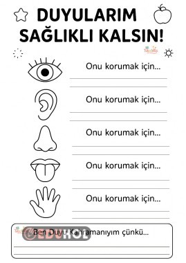 Duyuları hem boyayacaklar hem de sağlığını koruyabilmek için neler yapabileceklerini kısaca yazacaklar. En son bölümde duyu larını sağlıklı kullanan bir kahraman olma nedenini kısaca yazabilecekleri alan var. İster panoda afiş isterseniz deftere kesi ...