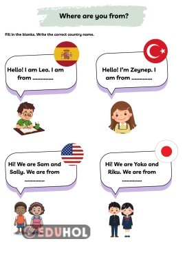 5. sınıf 1. ünite kapsamında hazırlanmış "Where .... from?" kalıbını ve İngilizce ülke isimlerini öğretmek için hazırlanmış üç sayfadan oluşan bir etkinliktir. Son sayfada klasik beş soru ve bir adet True/ False etkinliği bulunmaktadır.