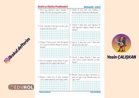 - 2.sınıf düzeyindeki öğrenciler için deste ve düzine kavramlarını içeren 10 adet problem yer almaktadır. Etiketler: matematik problem deste düzine