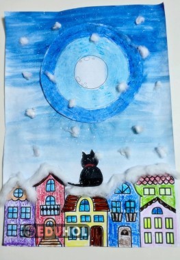 Sulu boya, alt zemine uygulanır. Kuruyunca ev modeli yapıştırılır. İster kuru , ister keçeli, isterse pastel boya ile ev ve dolunay çevresi boyanabilir. Kedi çatıya yapıştırılır.