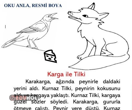 Karga İle Tilki 1. Sınıf, okuduğunu anlama kısa metin Metni oku, soruları cevapla ve resmi boya..