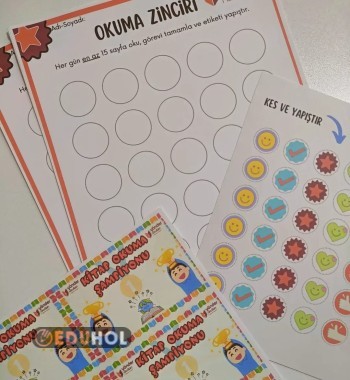 Okuma zinciri. Listesini tamamlayana motivasyon kartı veriyorum. En çok kart biriktirene yıl sonu hediye alıyorum. Sticker sayfasını yapışkanlı kağıda basıyorum etiket gibi ama normal kağıda da olabilir.