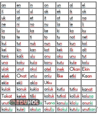 u sesi hece ve kelime tablosu
