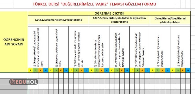TÜRKÇE - "DEĞERLERİMİZLE VARIZ" TEMASI KONTROL LİSTESİ