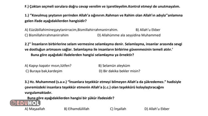 4.sinifi bitirenler için din kültürü ve ahlak bilgisi testi