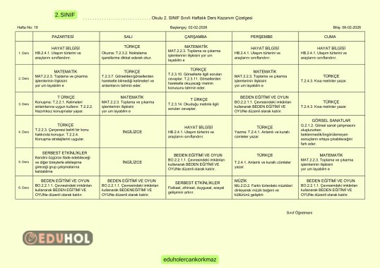 2. Sınıf ders defteri kazanım yazma 19 hafta 02-06.02.2026