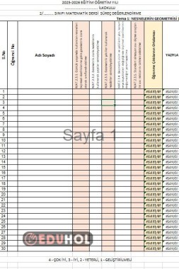 2. Sınıf Matematik Dersi Süreç Değerlendirme Çizelgesi