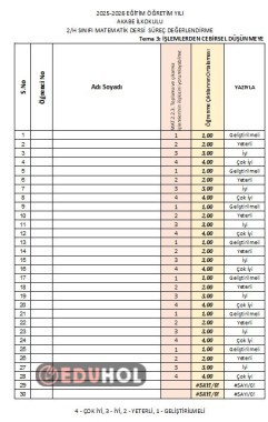 2. Sınıf Toplama çıkarma ilişkisi değerlendirme çizelgesi