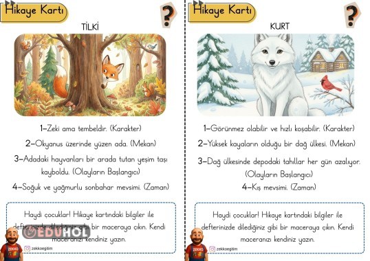 "Dönem Sonu Faaliyetleri" kapsamında yaratıcı okur yazar etkinliği için hikaye kartları. Çocuklar istediği kartı seçerek ona uygun hikayelerini yazarlar.