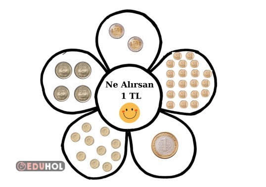 Etkinlikte öğrenciler, 1 TL’nin farklı madeni paralar kullanılarak nasıl oluşturulabileceğini incelemişlerdir.