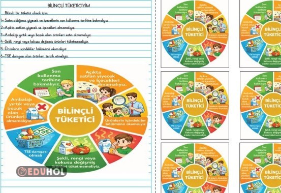 Hayat Bilgisi Bilinçli Tüketici konusu kısa maddeler halinde özet ve deftere yapıştırmalık görsel. 1 sayfada 6 görsel var.
