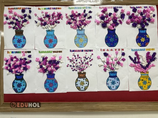 İlkbahar vazomuzu farklı renklerde krapon kağıtları ile dallarına çiçek kondurup yaptık.