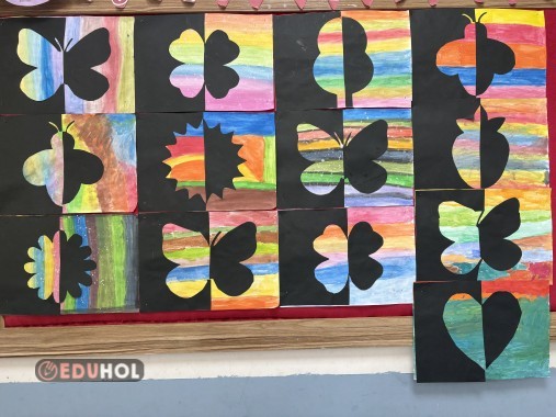 Arka plan suluboya ile boyanır. Daha sonra simetrik görseller siyah a4’e çıkarılır ve yarısı kesilir. Ardından görsel simetrik olarak kesilir ve çıkan kısım ters çevirilip yapıştırılır.