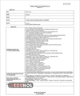 1. Sınıf 7. Hafta Günlük Ders Planları Tymm Uyumlu
